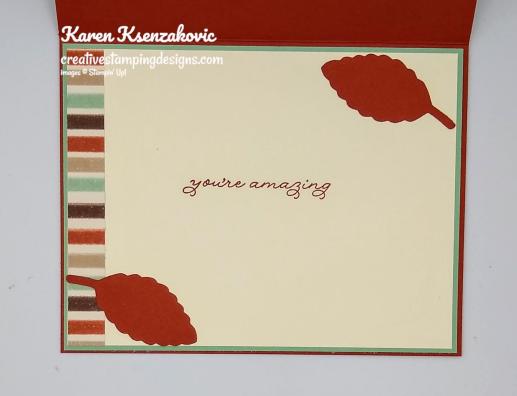 On the inside I stamped the sentiment from the Stampin’ Up! Orate Thanks Photopolymer Stamp Set in Cajun Craze Ink in the center of a Very Vanilla panel. I adhered a strip of the Gilded Autumn Specialty DSP to the side of the panel using Stampin’ Seal. I adhered 2 of the leaves that I cut from the card front panel to the inside using Multipurpose Liquid Glue. I adhered the Very Vanilla panel to a Mint Macaron mat using Stampin’ Seal and then to the inside of the Cajun Craze card base using Multipurpose Liquid Glue.
