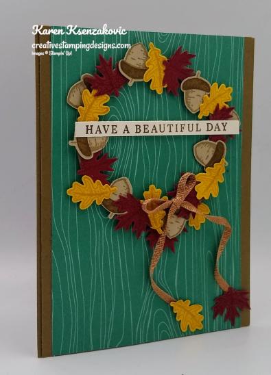 I ran some Stampin’ Seal around the wreath base and adhered the leaves and acorns on it the way I liked them. I had to add a few Glue Dots to hold some of the leaves in place. I adhered the wreath to the card front using Stampin’ Dimensionals. On a thin strip of Very Vanilla cardstock I stamped the sentiment from the Beautiful Autumn stamp set in Soft Suede Ink and adhered it to the card front using Mini Stampin’ Dimensionals and Glue Dots. I tied a bow using the new 1/8″ Copper Grosgrain Ribbon, from the Basket Weave & Metallic Ribbon Combo Pack, leaving the tails long. I adhered the bow to the wreath using a Glue Dot and adhered 2 leaves to the tails of the bow using Glue Dots.
