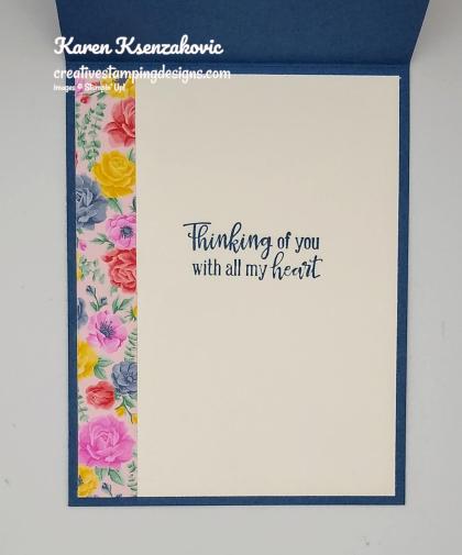 On the inside I stamped the sentiment from the Stampin’ Up! Peaceful Moments Cling Stamp Set in Misty Moonlight Ink in the center of a Whisper White panel. I adhered a strip of the Flowers For Every Season DSP to the side of the panel. I adhered the Whisper White panel to the inside of the Misty Moonlight card base using Stampin’ Seal.
