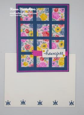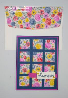 I started by cutting a panel of Flowers For Every Season Designer Series Paper into 1″ squares using my Paper Trimmer. I then arranged them on a Misty Moonlight card front and adhered them using Multipurpose Liquid Glue.