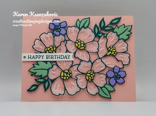 I started by stamping the rose image from the Stampin’ Up! Flowering Blooms Cling Stamp Set, colored using my Granny Apple Green and Merry Merlot Stampin’ Write Markers, on a panel of Whisper White cardstock. I colored the roses in using my Flirty Flamingo Stampin’ Blends Markers.