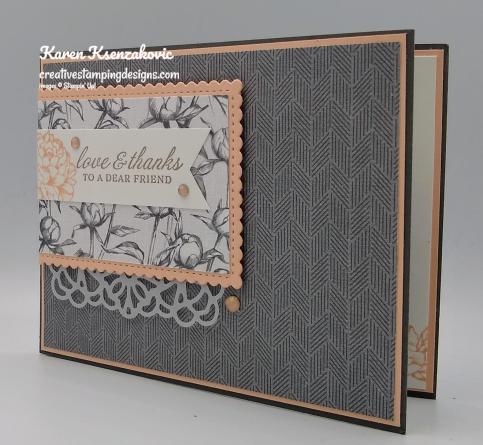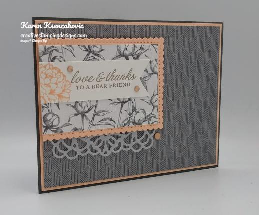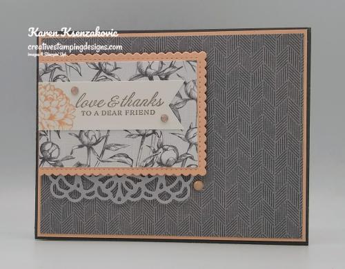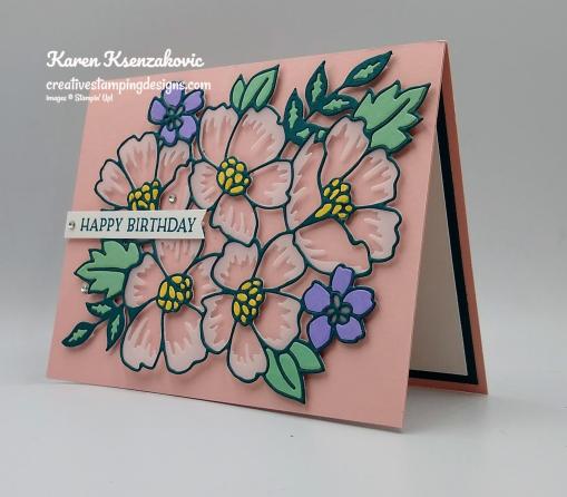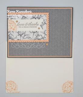 I stamped the sentiment from the Stampin’ Up! Peaceful Moments Cling Stamp Set in Merry Merlot Ink next to the flower image on the bottom of the panel. I adhered the card front to a Flirty Flamingo mat using Stampin’ Seal and then to the front of a Merry Merlot card base using Stampin’ Dimensionals. I added a few Pumpkin Pie Holiday Rhinestone Basic Jewels on the card front.