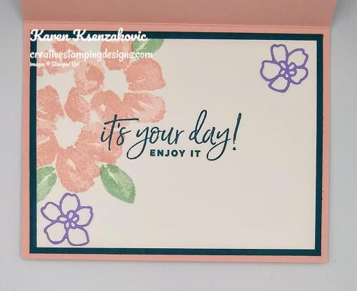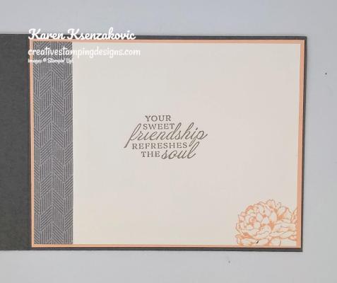 On the inside I stamped the sentiment from the Peaceful Moments stamp set in Merry Merlot Ink in the center of a Whisper White panel. I stamped the rose image from the Flowering Blooms stamp set, colored with my Granny Apple Green and Merry Merlot Stampin’ Write Markers, on the bottom of the panel. I colored the roses in using my Flirty Flamingo Stampin’ Blends Markers. I adhered the Whisper White panel to a Flirty Flamingo mat using Stampin’ Seal and then to the inside of the Merry Merlot card base using Multipurpose Liquid Glue.