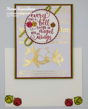 To finish my card I decorated a Medium Whisper White Envelope. I stamped the pine boughs from the Peaceful Boughs stamp set in Shaded Spruce Ink on the envelope front and flap. I stamped the splatter image from the Peaceful Boughs stamp set in Soft Suede Ink around the pine boughs. I stamped a couple pine cones from the Peaceful Boughs stamp set on the envelope flap.