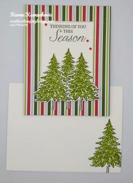 To complete my card I decorated a Medium Whisper White Envelope. I stamped the outline tree image from the In The Pines stamp set in Mossy Meadow Ink on the envelope front. I stamped the fill image tree from In The Pines stamp set over the outline image in Pear Pizzazz Ink. I adhered a panel of Heartwarming Hugs DSP to the envelope flap.