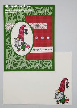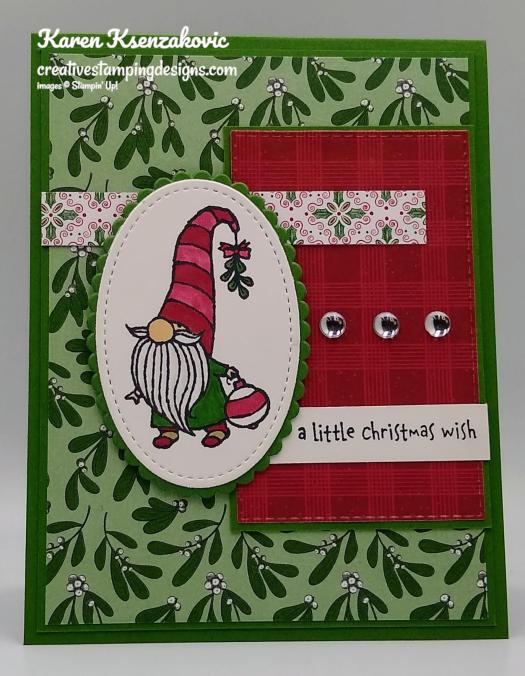 On a panel of Whisper White cardstock I stamped the adorable gnome image from the Stampin’ Up! Gnome For The Holidays Cling Stamp Set in Tuxedo Black Memento Ink. I colored the image in using my Cherry Cobbler, Crumb Cake, Gray Granite, Ivory and Real Red Stampin’ Blends Markers and my Garden Green Stampin’ Write Marker. I cut the image out using the 2nd largest oval from the Stitched Shapes Dies. I cut a scalloped oval from the Layering Ovals Dies from a panel of Garden Green cardstock and adhered the artwork to it using Stampin’ Seal. I cut a strip of ‘Tis The Season DSP and adhered it to the top section of the card front using Glue Dots.