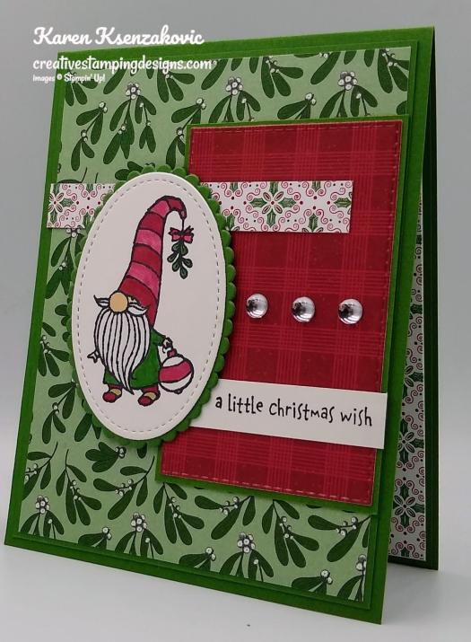 On a strip of Whisper White cardstock I stamped the sentiment from the Gnome For The Holidays stamp set in Tuxedo Black Memento Ink and adhered it to the bottom portion of the card front using Glue Dots. I adhered the matted artwork to the card front using Stampin’ Dimensionals. I adhered the card front to a Garden Green card base using Multipurpose Liquid Glue. I added a few of the clear epoxy droplets from the Frosted & Clear Epoxy Droplets to the card front.