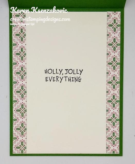 On the inside I stamped the sentiment from the Gnome For The Holidays stamp set in Tuxedo Black Memento Ink in the center of a Whisper White panel. I adhered 2 strips of ‘Tis The Season DSP to the sides of the panel using Stampin’ Seal. I adhered the Whisper White panel to a Garden Green mat using Stampin’ Seal and then to the inside of the Garden Green card base using Multipurpose Liquid Glue.