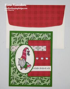 To finish my card I decorated a Medium Whisper White Envelope. I stamped the gnome image from Gnome For The Holidays stamp set in Tuxedo Black Memento Ink on the envelope front. I colored the image in the same as I did for the card. I adhered a panel of ‘Tis The Season DSP to the envelope flap.