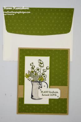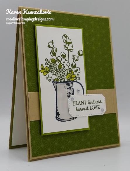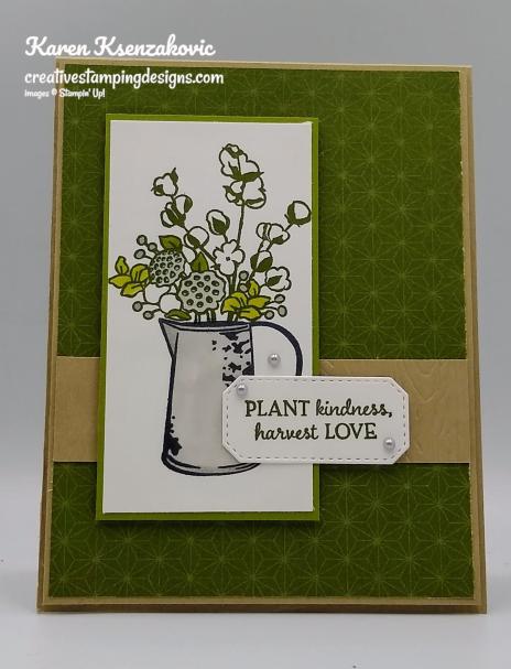 On a panel of Whisper White cardstock I stamped the pitcher image from the Stampin’ Up! Country Home Photopolymer Stamp Set in Tuxedo Black Memento Ink. I stamped the floral image from the Country Home stamp set on top of the pitcher in Mossy Meadow Ink. I colored the images in using my Gray Granite and Old Olive Stampin’ Blends Markers. I adhered the artwork on an Old Olive mat using Stampin’ Seal and adhered it to the card front using Stampin’ Dimensionals.