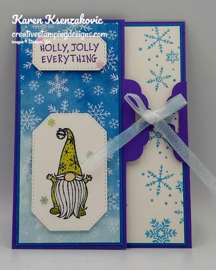 I adhered a panel of Snowflake Splendor Designer Series Paper to a Pacific Point mat using Stampin’ Seal and then adhered it to the front panel using Multipurpose Liquid Glue.  On a small panel of Whisper White cardstock I stamped the gnome image from the Stampin’ Up! Gnome For The Holidays Cling Stamp Set in Tuxedo Black Memento Ink.  I stamped the sentiment from the Gnome for the Holidays stamp set in Gorgeous Grape Ink on the top of the Whisper White panel.  I colored the gnome in using my Ivory and Old Olive Stampin’ Blends Markers and I used Clear Wink of Stella on the gnomes beard.  I cut the image out using my Hippo & Friends Dies and I cut the sentiment out using the smallest octagon die from the Hippo & Friends Dies.  I adhered the artwork and sentiment to the card front using Stampin’ Dimensionals.  I added a few Adhesive-Backed Snowflakes to the card front.