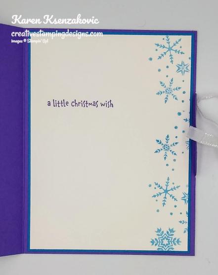 On the inside I stamped the snowflake cluster image from the Stampin’ Up! Snowflake Wishes Photopolymer Stamp Set in Pacific Point Ink, stamping off once, along the edge of a Whisper White panel.  I stamped the sentiment from the Gnome for the Holidays stamp set in Gorgeous Grape Ink to the left of the panel.  I adhered the Whisper White panel to a Pacific Point mat using Stampin’ Seal and then to the inside of the Gorgeous Grape card base using Multipurpose Liquid Glue.