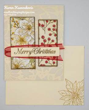 To finish my card I decorated a Medium Very Vanilla Envelope.  I stamped the flower image from the Poinsettia Petals stamp set in Soft Suede Ink, stamping off once, on the envelope front.  I adhered a panel of Poinsettia Place DSP to the envelope flap.