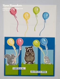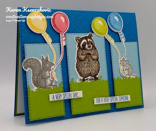 I adhered the racoon image to the largest rectangle and the squirrel and mouse images to the smaller rectangles using Glue Dots, tucking them in the grass a little. I adhered the rectangles to the card front using Stampin’ Dimensionals. I adhered the strings and balloons to the squirrel and mouse using Stampin’ Dimensionals. On 1/4″ strips of Whisper White cardstock I stamped the sentiments from the Special Someone stamp set in Pacific Point Ink and adhered them to the artwork using Mini Stampin’ Dimensionals.