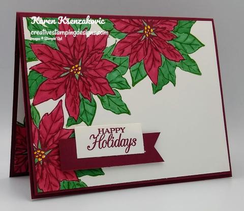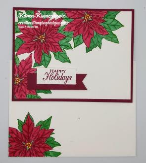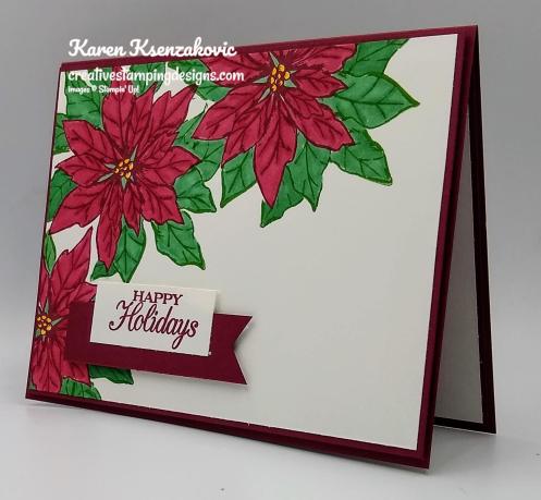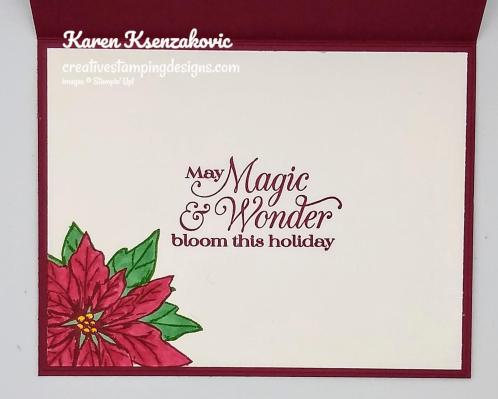 On the inside I stamped the sentiment from the Poinsettia Petals stamp set in Merry Merlot Ink in the center of a Whisper White panel. I stamped the poinsettia image from the Poinsettia Petals stamp set in Merry Merlot Ink on the bottom of the panel. Using the Masking Technique again, I stamped the largest layering poinsettia image from the Poinsettia Petals stamp set in Garden Green Ink over the image. I colored the image in using my Cherry Cobbler, Daffodil Delight and Just Jade Stampin’ Blends Markers. I adhered the Whisper White panel to a Merry Merlot mat using Stampn’ Seal and then to the inside of the Merry Merlot card base using Multipurpose Liquid Glue.
