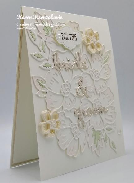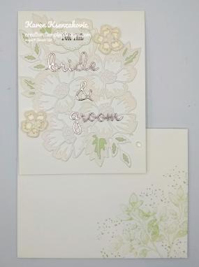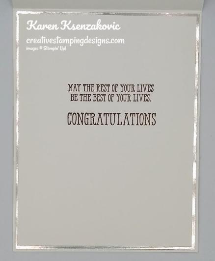 On a small panel of Whisper White cardstock I stamped the sentiment from the Stampin’ Up! Well Said Cling Stamp Set in Soft Suede Ink.  I cut the sentiment out using the smallest die from the Stitched So Sweetly Dies and edged it using my Soft Seafoam Stampin’ Write Marker.  I adhered it to the card front using Stampin’ Dimensionals.  I cut the ‘bride  groom’ out of a panel of Champagne Foil Sheet using the Well Written Dies and adhered them to the card front, over the flowers, using my Fine Tip Glue Pen.  I added a few of the clear Elegant Faceted Gems to the card front.