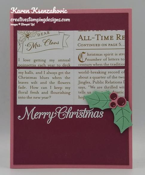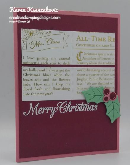 I cut 2 holly leaves out of a panel of Mint Macaron cardstock using the Sweetest Borders Dies.  I stamped the berry image from the Stampin’ Up! Sweetest Time Photopolymer Stamp Set in Merry Merlot Ink on a scrap of Rococo Rose and cut them out using the Sweetest Borders Dies.  I adhered the holly leaves to the side of the card front using Stampin’ Dimensionals and the berries on top of the leaves using a Glue Dot.