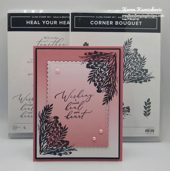 My card uses the Stampin’ Up! Corner Bouquet Cling Stamp Set and Stampin’ Up! Heal Your Heart Cling Stamp Set along with the Oh So Ombre 6 X 6 Designer Serie Paper. All items are from the 2021 Sale-A-Bration Catalog starting January 5, 2021.