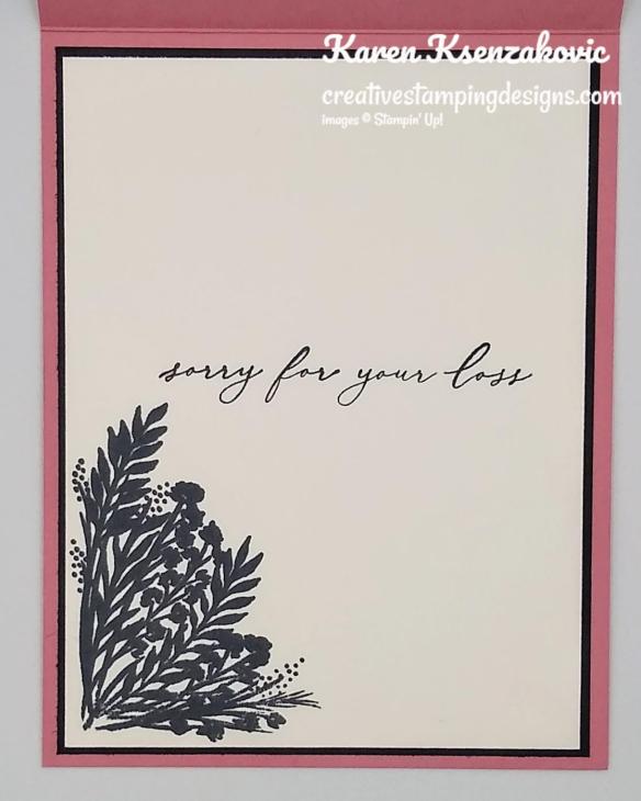 On the inside I used the Stamparatus to stamp the Corner Bouquet image in the bottom left corner of a Whisper White panel in Tuxedo Black Memento Ink. I stamped the sentiment from the Heal Your Heart stamp set in Tuxedo Black Memento Ink in the center of the panel. I adhered the Whisper White panel to a Basic Black mat using Stampin’ Seal and then to the inside of the Rococo Rose card base using Multipurpose Liquid Glue.