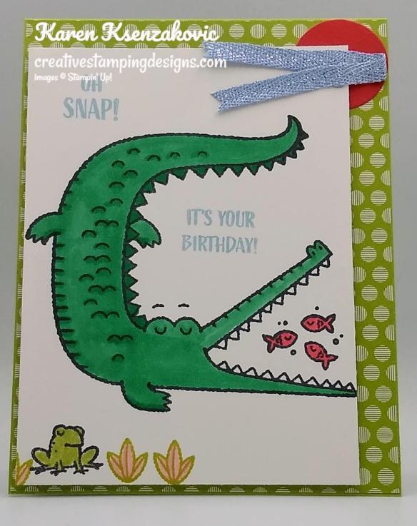 I have a sneak peek for you of an upcoming set from the January-June 2021 Mini Catalog. I saw this set and my little nephew loves alligators and crocodiles so I just had to get it. It’s the Stampin’ Up! Oh Snap Photopolymer Stamp Set. Here’s my card for today.