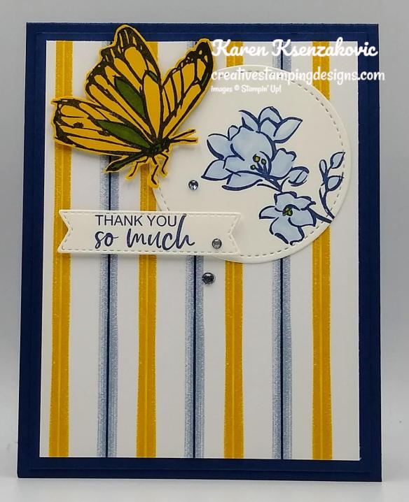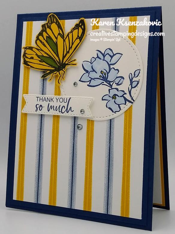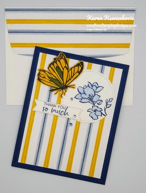 On the inside I stamped the sentiment from the Stampin’ Up! Ornate Thanks Photopolymer Stamp Set in Night of Navy Ink in the center of a Basic White panel. I stamped the butterfly image from A Touch Of Ink stamp set in Crushed Curry Ink, stamping off once, over the sentiment. I adhered the Basic White panel to a Crushed Curry mat using Stampin’ Seal and then to the inside of the Night of Navy card base using Multipurpose Liquid Glue.