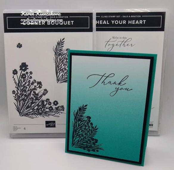I used the Stampin’ Up! Corner Bouquet Cling Stamp Set, the Stampin’ Up! Heal Your Heart Cling Stamp Set and the Oh So Ombre 6 X 6 Designer Series Paper for my card today. Each of these items are FREE with a $50 order.