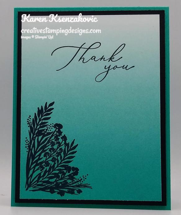 I started by stamping the smaller bouquet from the Corner Bouquet stamp set in Tuxedo Black Ink on the bottom of a Bermuda Bay panel of Oh So Ombre DSP.
