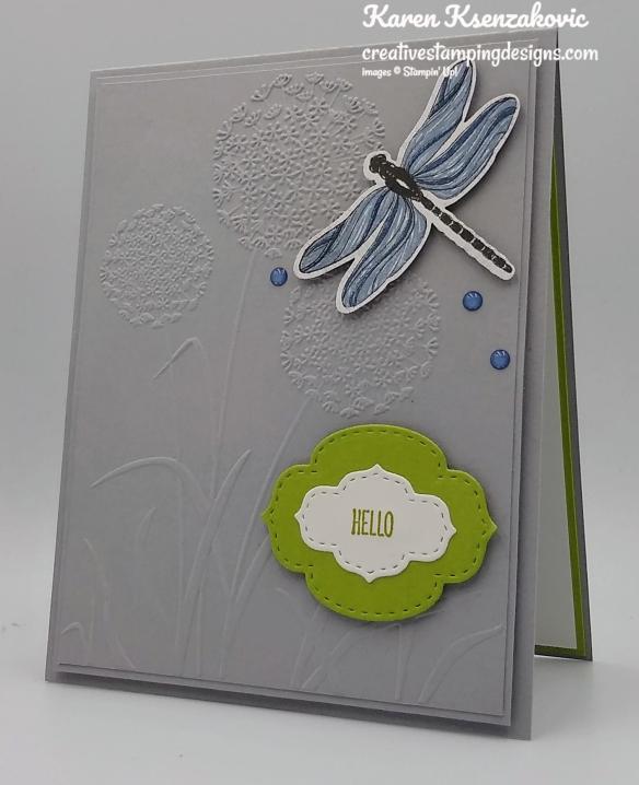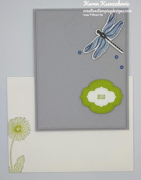 I stamped the sentiment from the Garden Wishes stamp set in Pear Pizzazz Ink on a panel of Basic White cardstock in Pear Pizzazz Ink. I cut the sentiment out using the Stitched So Sweetly Dies. I cut a mat from a panel of Pear Pizzazz cardstock using the larger die from the Stitched So Sweetly Dies. I adhered the sentiment to the mat using Multipurpose Liquid Glue. I adhered the layered panel to the card front using Stampin’ Dimensionals. I punched one of the dragonflies out of a panel of the Dandy Garden Designer Series Paper using my Dragonflies Punch and adhered it to the card front using Stampin’ Dimensionals.