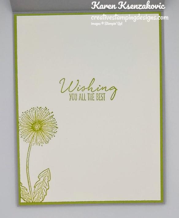 On the inside I stamped the sentiment from the Garden Wishes stamp set in Pear Pizzazz Ink in the center of a Basic White panel. I stamped the dandelion image from the Garden Wishes stamp set in Pear Pizzazz Ink on the bottom of the panel. I adhered the Basic White panel to a Pear Pizzazz mat using Stampin’ Seal and then to the inside of the Smoky Slate card base using Multipurpose Liquid Glue.