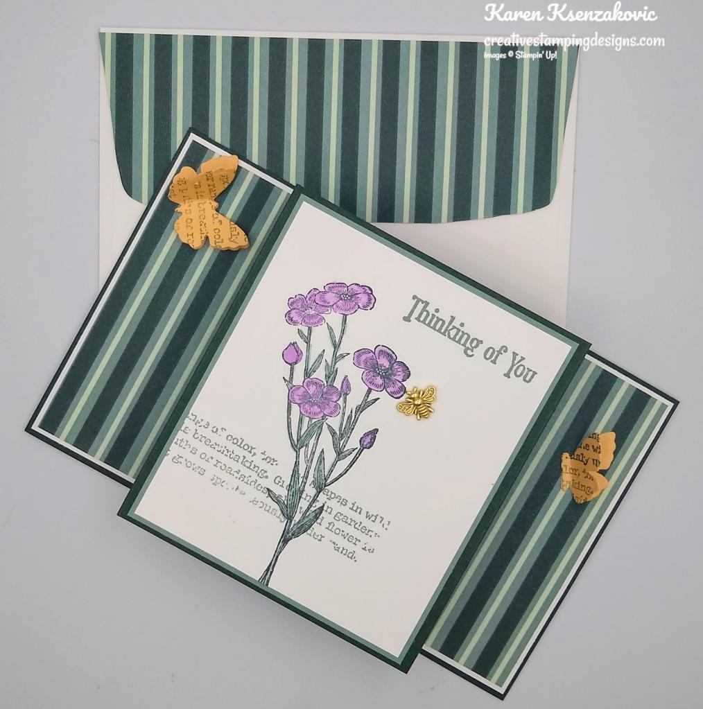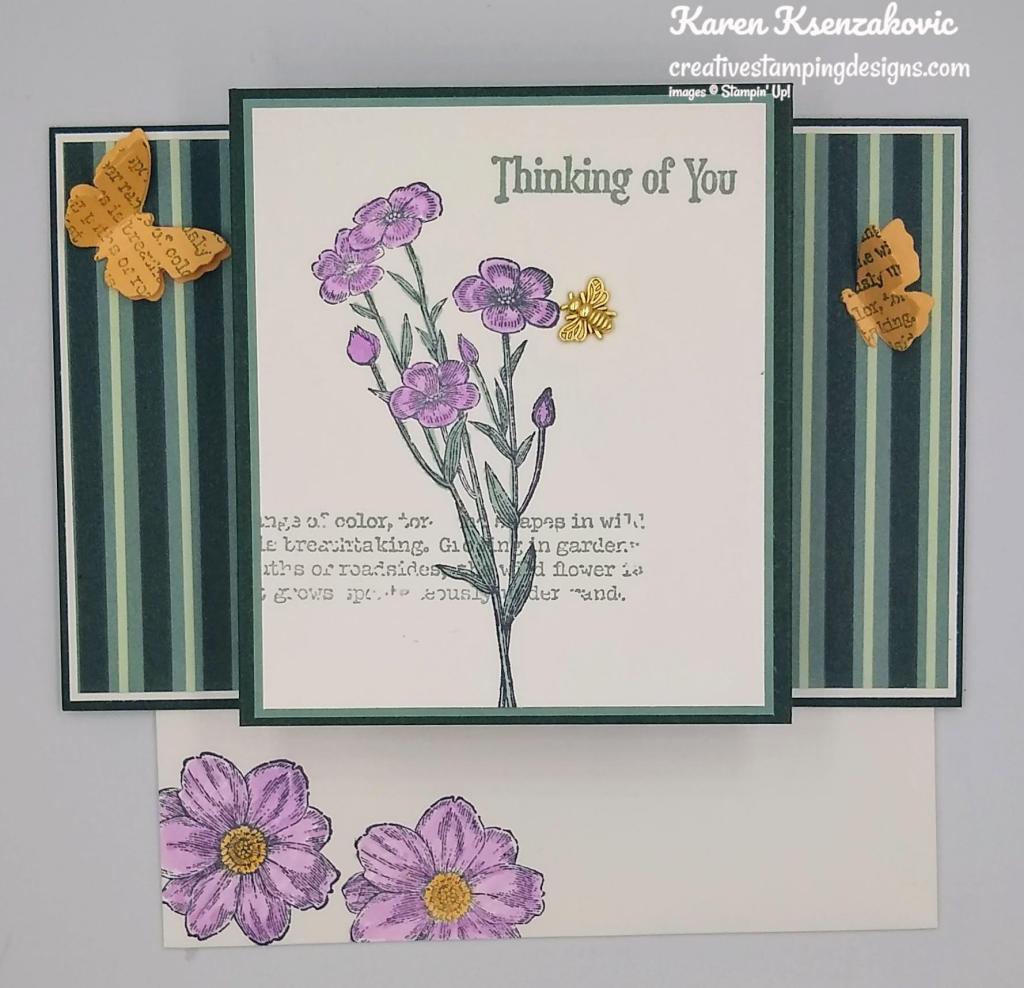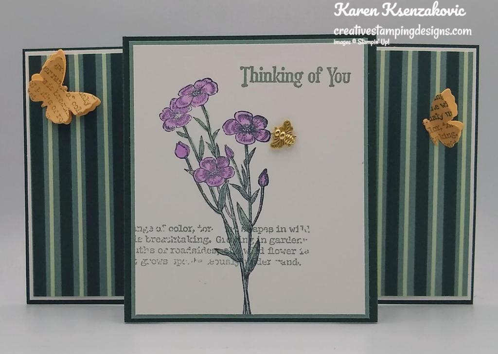 I used the new Stampin’ Up! Quiet Meadow Bundle for my card along with the Pansy Petals Designer Series Paper.