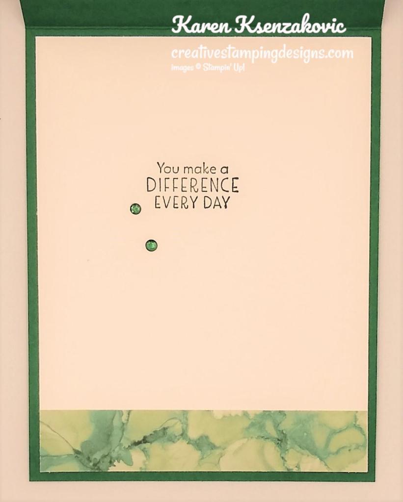 On the inside I stamped the sentiment from the Stampin’ Up! Inspired Thoughts Cling Stamp Set in the center of a Basic White panel. I adhered a strip of the Expressions In Ink DSP to the bottom of the panel using Stampin’ Seal. I adhered the Basic White panel to the inside of the Shaded Spruce card base using Stampin’ Seal.