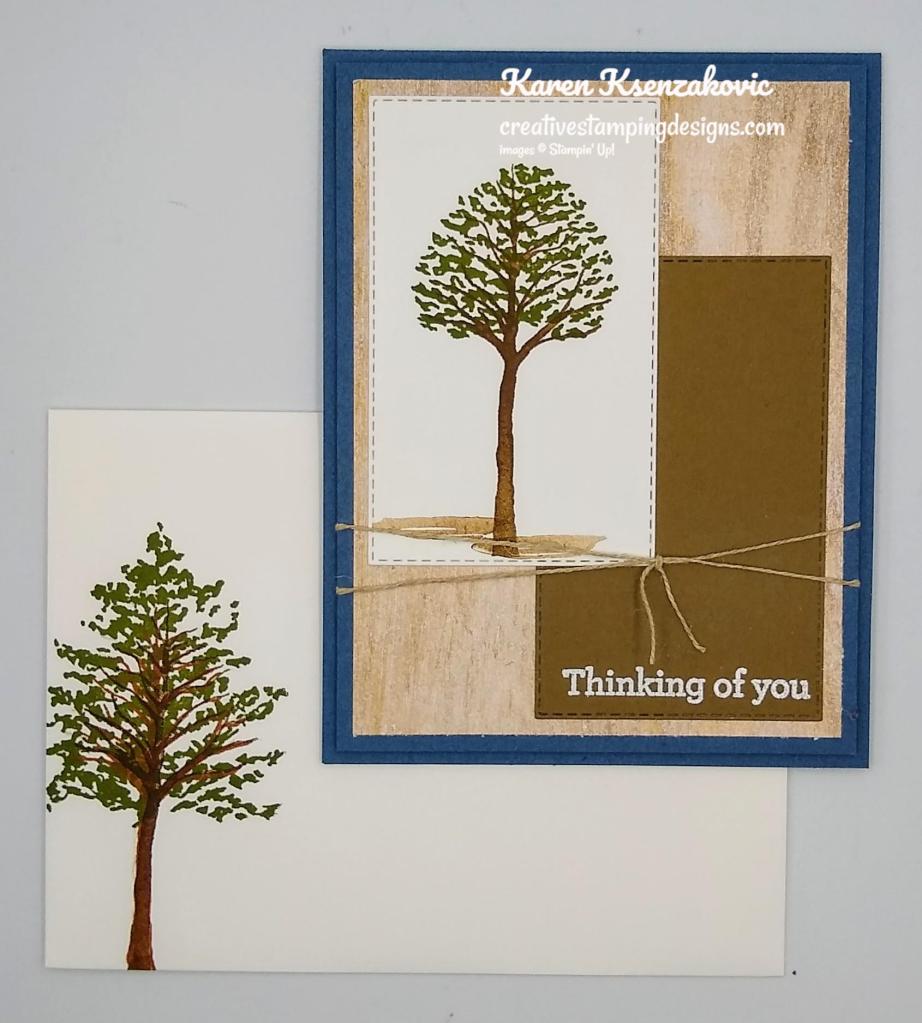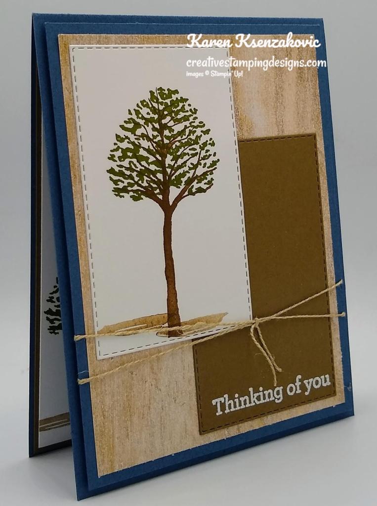 I cut a panel of Basic White cardstock using the 4th from the smallest Stitched Rectangle Die. I stamped the tree image from the Beauty Of Friendship stamp set in Soft Suede Ink on the panel. I stamped the tree top image from the Beauty Of Friendship stamp set in Old Olive Ink on top of the branches. I stamped the ground image in Soft Suede Ink, stamping off once, on either side of the bottom of the tree trunk. I adhered the panel to the card front overlapping the Soft Suede panel, using Multipurpose Liquid Glue. I wrapped a piece of Linen Thread around the card front twice and tied a knot. I adhered the card front to a Misty Moonlight card base using Stampin’ Dimensionals.