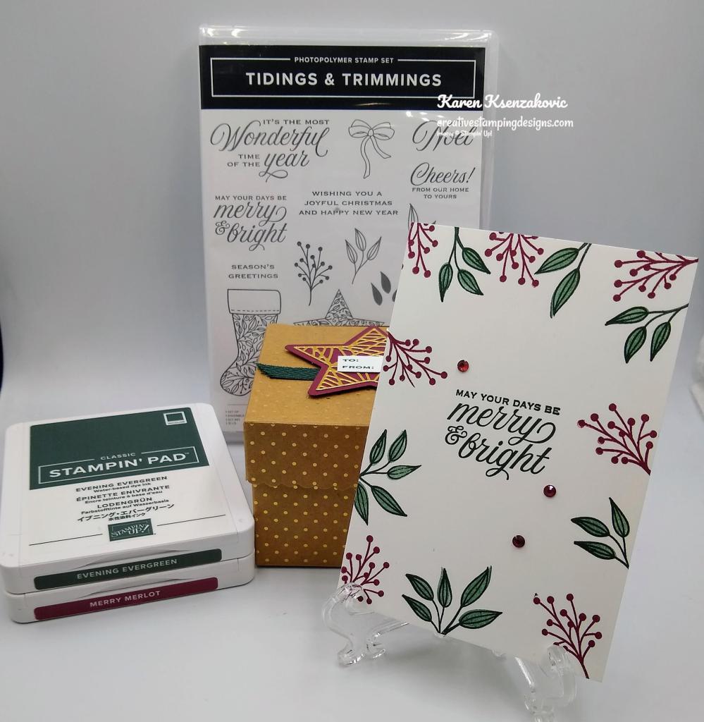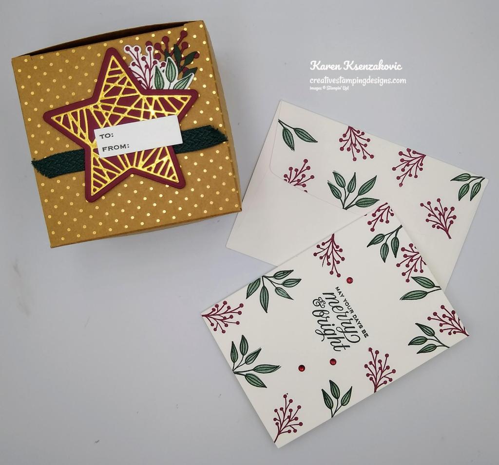 I assembled the Scalloped Craft Treat Box and adhered a piece of the Evening Evergreen 3/8″ Chevron Weave Ribbon using a small amount of Stampin’ Seal on the top of the box. I cut a solid Merry Merlot star using my Christmas Trimmings Dies. I cut a detailed star from a panel of Gold Foil paper which was adhered to a piece of an Adhesive Sheet, and adhered it to the solid star. I adhered the star to the box top over the ribbon using Stampin’ Dimensionals. On a panel of Basic White cardstock I stamped the leaf image from the Stampin’ Up! Tidings & Trimmings Photopolymer Stamp Set in Evening Evergreen Ink. I stamped the berry image in Merry Merlot Ink on the panel of cardstock. I cut the images out using my Christmas Trimmings Dies. I cut another leaf die from a scrap of Evening Evergreen cardstock and the berry die from a scrap of Merry Merlot cardstock. I adhered the leaves and berries under the star using Multipurpose Liquid Glue. On a strip of Basic White cardstock I stamped the sentiment from the Tidings & Trimmings stamp set in Evening Evergreen Ink and adhered it to the star using Glue Dots.
