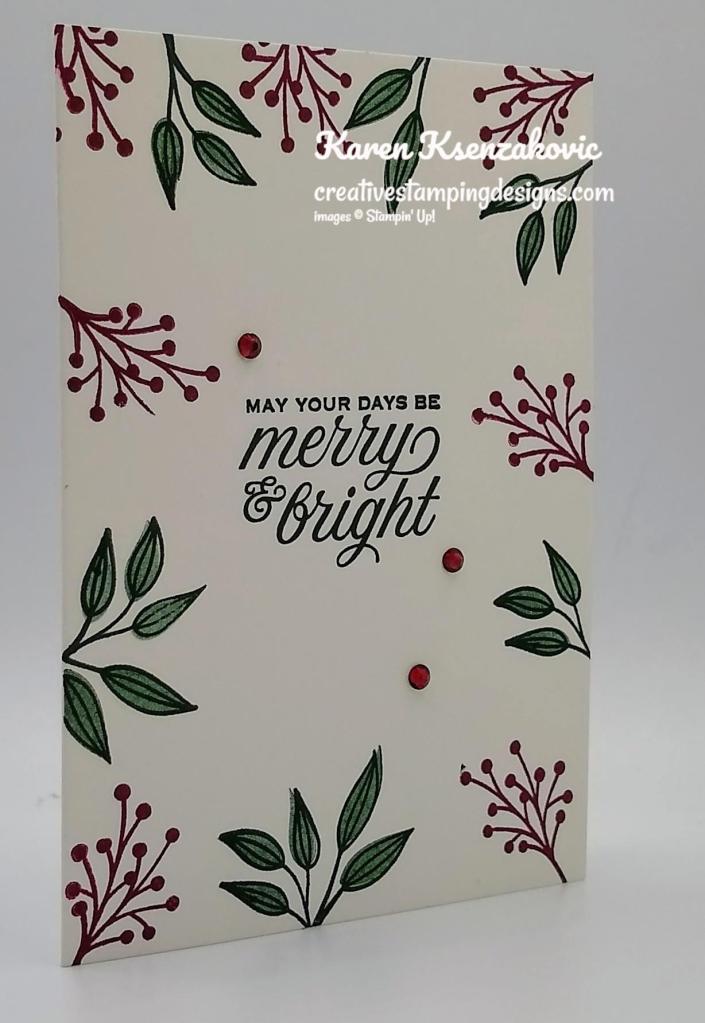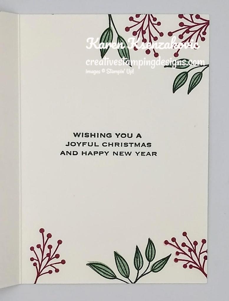 On the inside I randomly stamped the leaf and berry images from the Tidings & Trimmings stamp set in Evening Evergreen and Merry Merlot Inks on the top and bottom of the Basic White Note Card. I stamped the sentiment from the Tidings & Trimmings stamp set in Evening Evergreen Ink in the center of the card base.