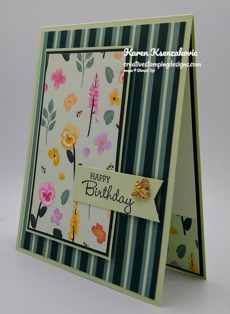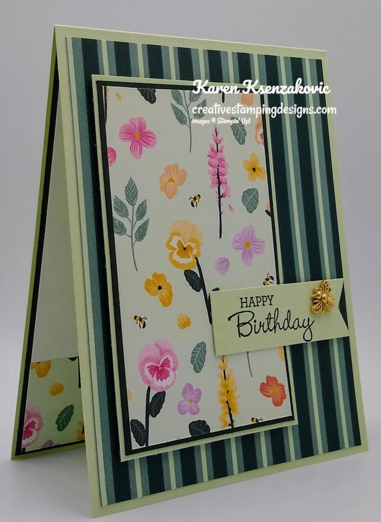 I used the Stampin’ Up! Pansy Patch Photopolymer Stamp Set along with the Pansy Petals Designer Series Paper for my card today.