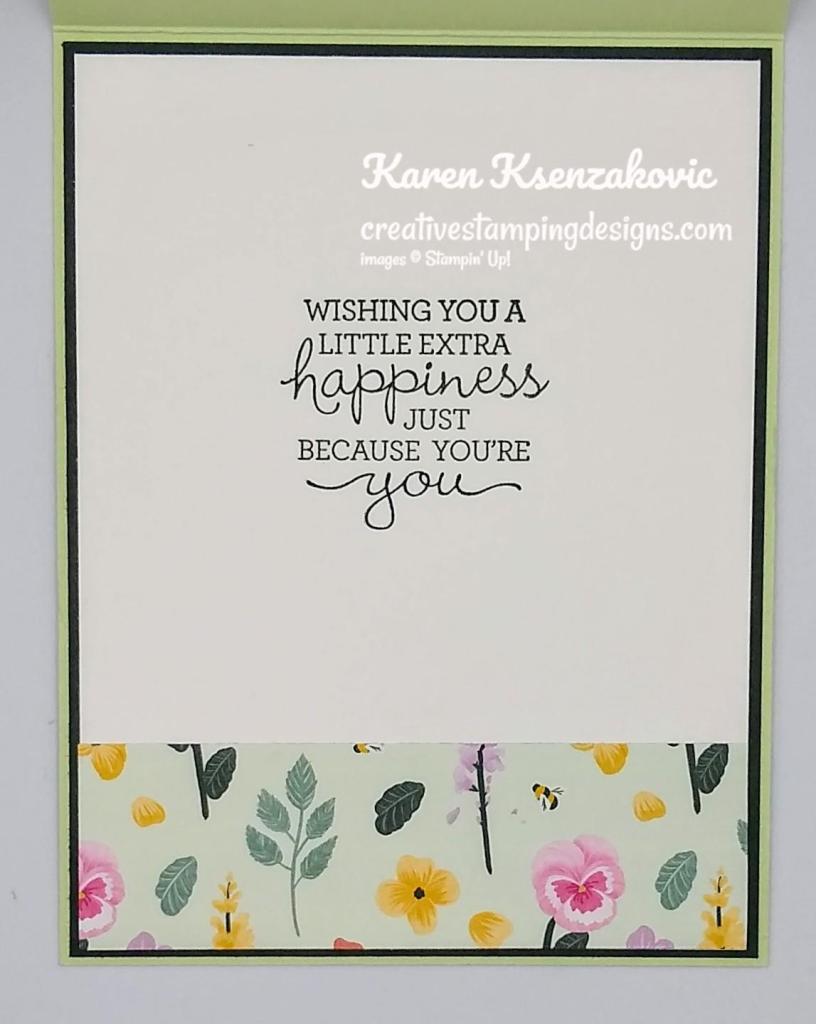 On the inside I stamped the sentiment from the Pansy Patch stamp set in Evening Evergreen Ink on a Basic White panel. I adhered a panel of the Pansy Petals DSP to the bottom of the panel using Stampin’ Seal. I adhered the Basic White panel to an Evening Evergreen mat using Stampin’ Seal and then to the inside of the Soft Sea Foam card base using Multipurpose Liquid Glue.