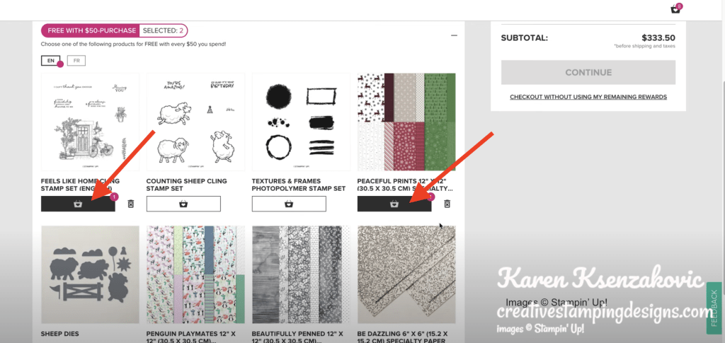 If you’ve earned the free host stamp set with an order of $300+, you can click the “+” button to the right of the header to add that item to your cart.
