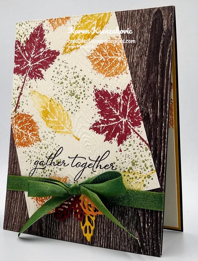 I wrapped a length of Old Olive/Pretty Peacock 3/8″ Reversible Ribbon around the card front and tied a bow. I adhered the card front to an Early Espresso card base using Stampin’ Dimensionals. I cut 3 of the small leaf dies from the Intricate Leaves Dies, from scraps of Cherry Cobbler, Crushed Curry and Pumpkin Pie cardstock. I adhered the leaves under the bow using Glue Dots.