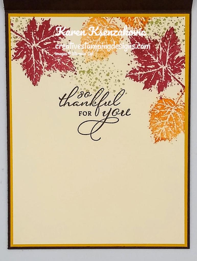 On the inside I stamped the sentiment from the Pretty Pumpkins stamp set in Early Espresso Ink on a Very Vanilla panel. I stamped the leaf and splotch images from the Gorgeous Leaves stamp set in Cherry Cobbler, Old Olive and Pumpkin Pie Inks on the top of the panel. I adhered the Very Vanilla panel to a Crushed Curry mat using Stampin’ Seal and then to the inside of the Early Espresso card base using Multipurpose Liquid Glue.