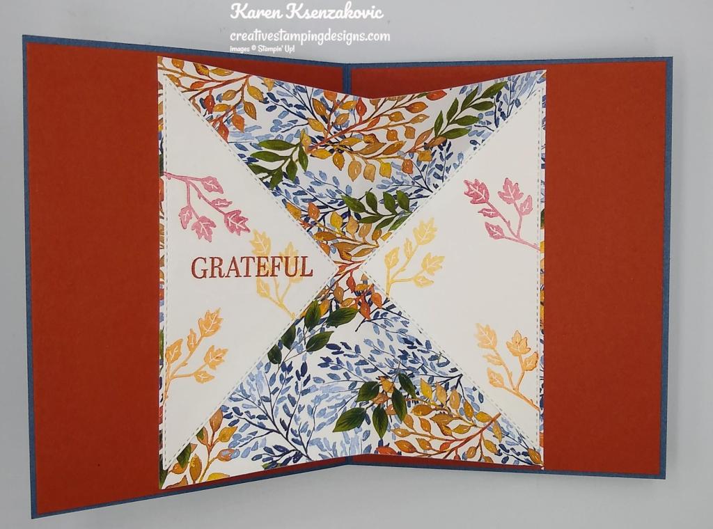 On the inside I adhered 2 panels of Cajun Craze cardstock using Multipurpose Liquid Glue. For the insert I used a panel of Beauty of The Earth DSP. I scored the panel first in half then diagonally from corner to corner both ways. The center half score line I folded as a mountain fold and the corner to corner score lines as valley folds. I adhered the panel to the inside of the card using Tear and Tape on the sides of the panel.