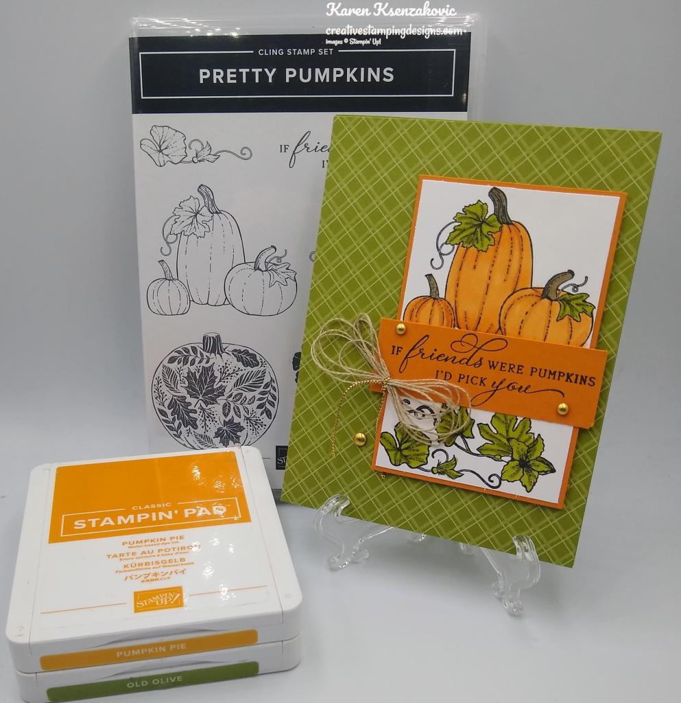 I used the Stampin’ Up! Pretty Pumpkin Cling Stamp Set along with the Regals 6 X 6 Designer Series Paper for my card today.