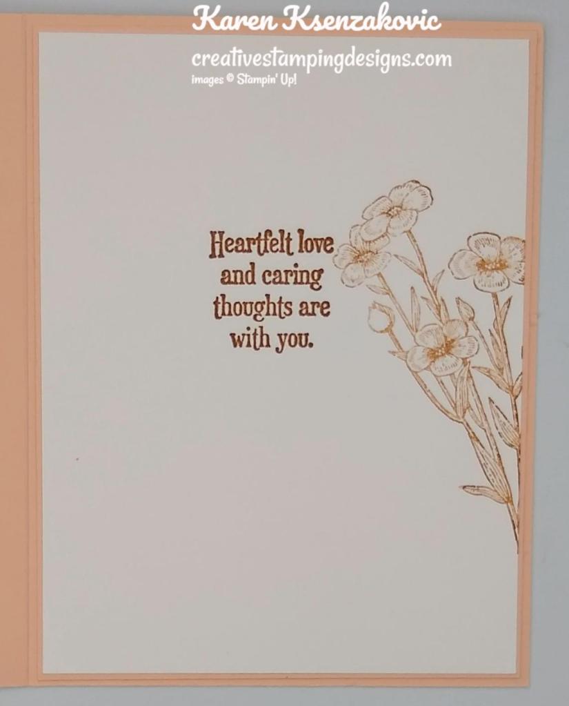 On the inside I stamped the sentiment from the Quiet Meadow stamp set in Cinnamon Cider Ink on a Basic White panel. I stamped the floral image from the Quiet Meadow stamp set in Cinnamon Cider Ink, stamping off once, on the side of the panel. I adhered the Basic White panel to a Petal Pink mat using Stampin’ Seal and then to the inside of the Petal Pink card base using Multipurpose Liquid Glue.
