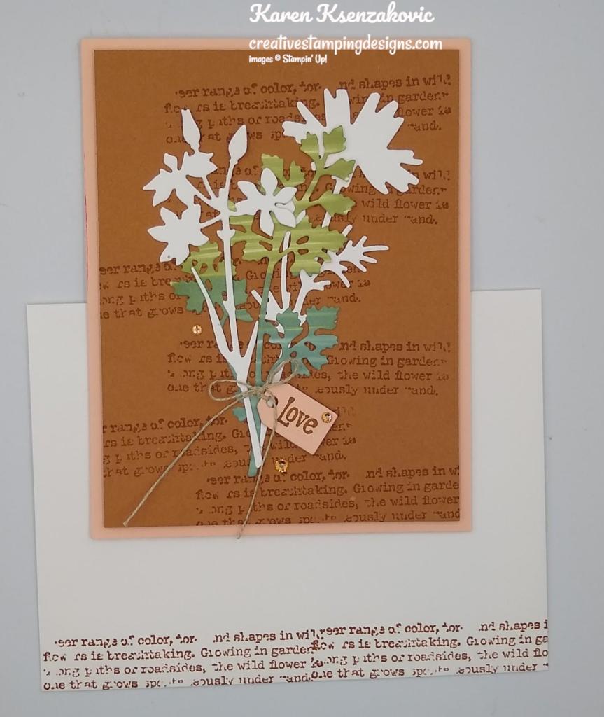 I started by randomly stamping the type image from the Quiet Meadow stamp set in Cinnamon Cider Ink on a Cinnamon Cider card front. I adhered the card front to a petal Pink card base using Stampin’ Dimensionals.