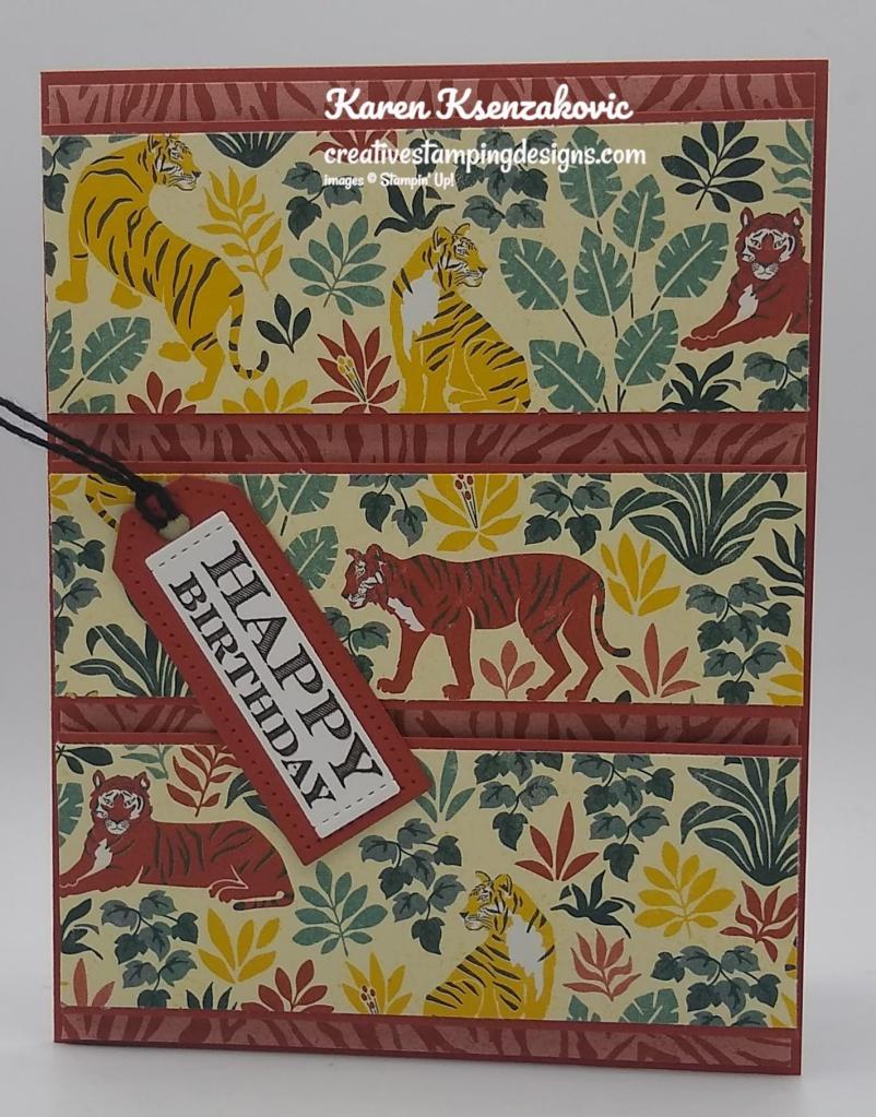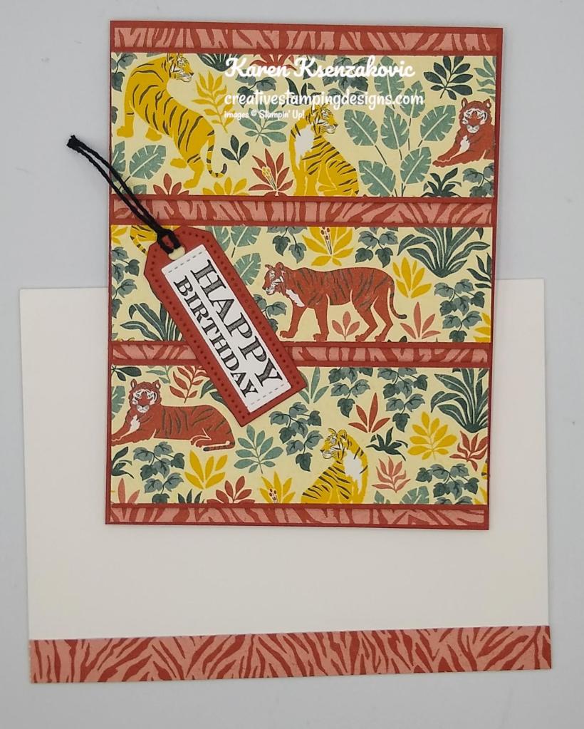 On the inside I stamped the sentiment from the In Your Words stamp set in Evening Evergreen Ink on a Basic White panel. I cut one of the tigers out of the In The Wild DSP and adhered it to the panel using Multipurpose Liquid Glue. I adhered the Basic White panel to an Evening Evergreen mat using Stampin’ Seal and then to the inside of the Cajun Craze card base using Multipurpose Liquid Glue.
