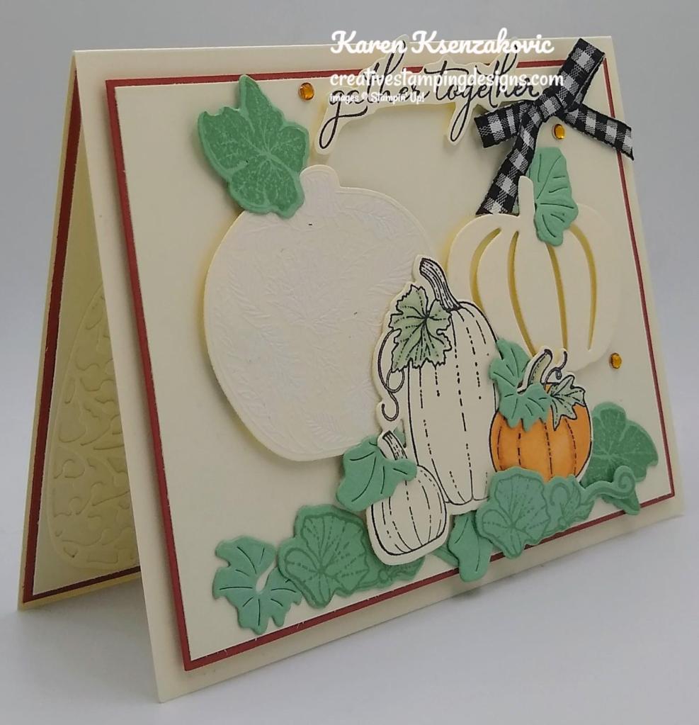I used the Stampin’ Up! Pretty Pumpkins Bundle for my Freestyle Collage card. I was inspired mostly by the cream colored pumpkins along with the other colors in the photo.