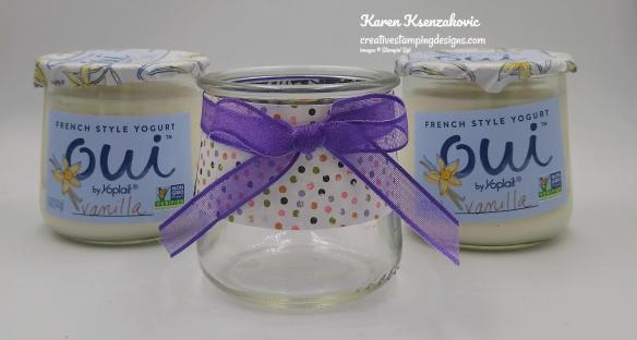 All you have to do is eat a jar (or 2) of the oui yogurt and you have a jar. The labels peel off really easy for easy washing. Cut 2 of the Warm Wrap Dies that are made to fit over our Mini Coffee Cups (#153493 page 137 from the 2021-2022 Annual Catalog) in any color DSP that you like. They fit perfectly around the neck of the jar. Adhere the wrap together on one side, then wrap it around the jar and adhere it on the other side while on the jar. Wrap a ribbon of your choice around the jar and tie a bow. I added a Glue Dot under the bow to hold it in place.