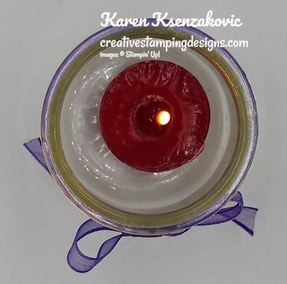 I have something a little different for you today, no stamping. With the holiday’s approaching quickly I thought I’d show you a little gift jar that I made. I showed it to one of my cashiers at work yesterday that’s a preschool teacher and she loved it. She’s going to have her preschoolers make it for a parent gift. It a great idea for girl scouts to make or if you have enough for a class project. Great little gift for kids to make for their grandparents and fill it with chocolates. This is also a great idea if your children have holiday shopping at their school, you can whip these up in not time. This would make a perfect holiday or winter gift using the Whimsy & Wonder DSP. Here’s my little gift jar.
