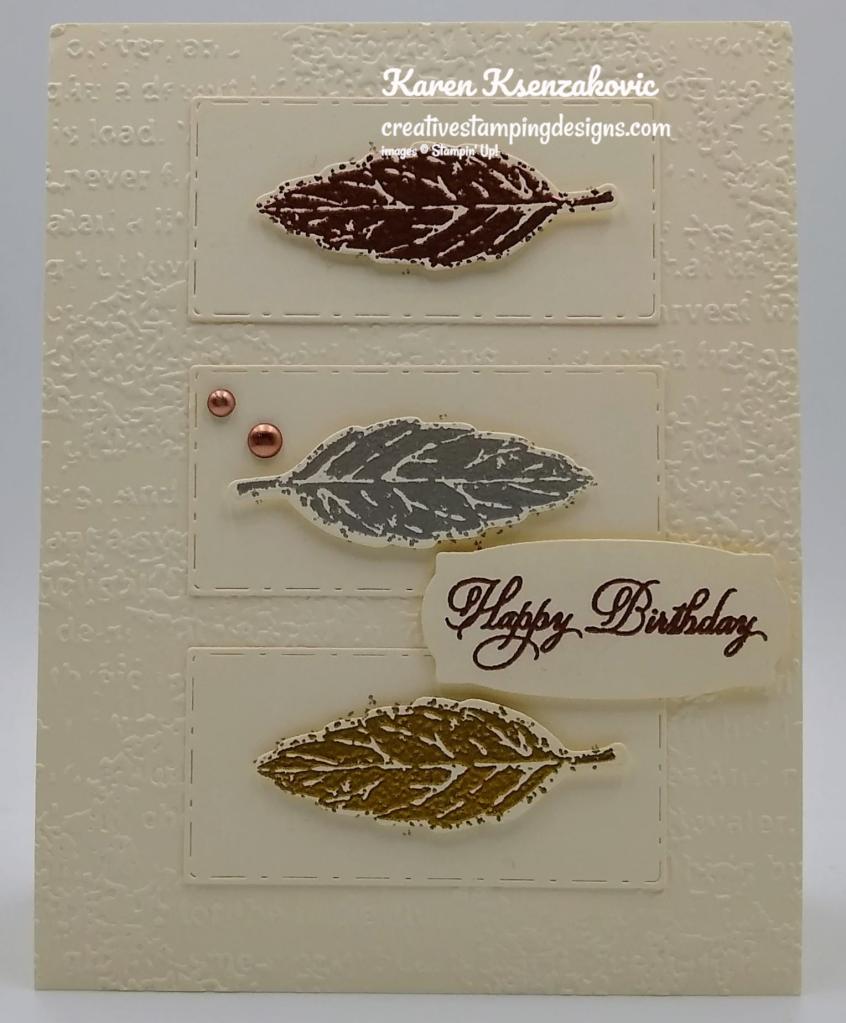 This beautiful card is from my amazing friend and team leader Amy Koenders. Love how the leaves are in the 3 metallic colors.