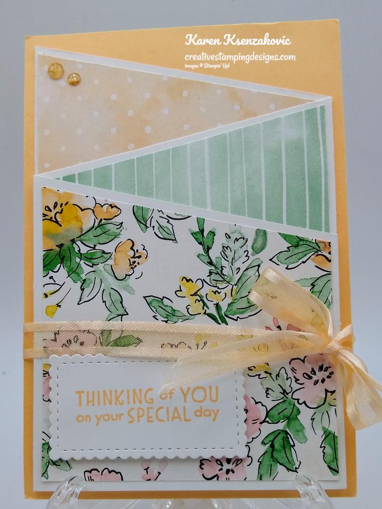 This gorgeous fun fold card is from my fun and energetic friend and upline Jaimie Babarczy. LOVE this DSP and the fun fold.
