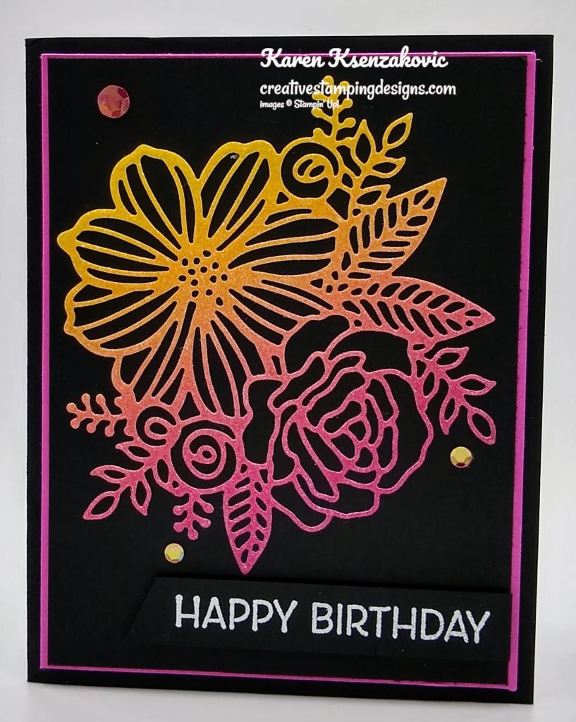 This beautiful card is from my team member Barb Ross. The pretty flowers are from the rainbow glimmer paper and it’s more gorgeous in person